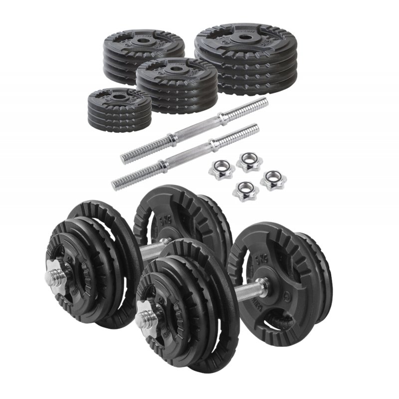 W skład zestawu wchodzą żeliwne talerze o odpowiednio dobranej masie, dzięki czemu wykonując ćwiczenia użytkownik ma możliwość dostosowania obciążenia do rodzaju treningu (rzeźba/masa) oraz możliwości psychofizycznych.