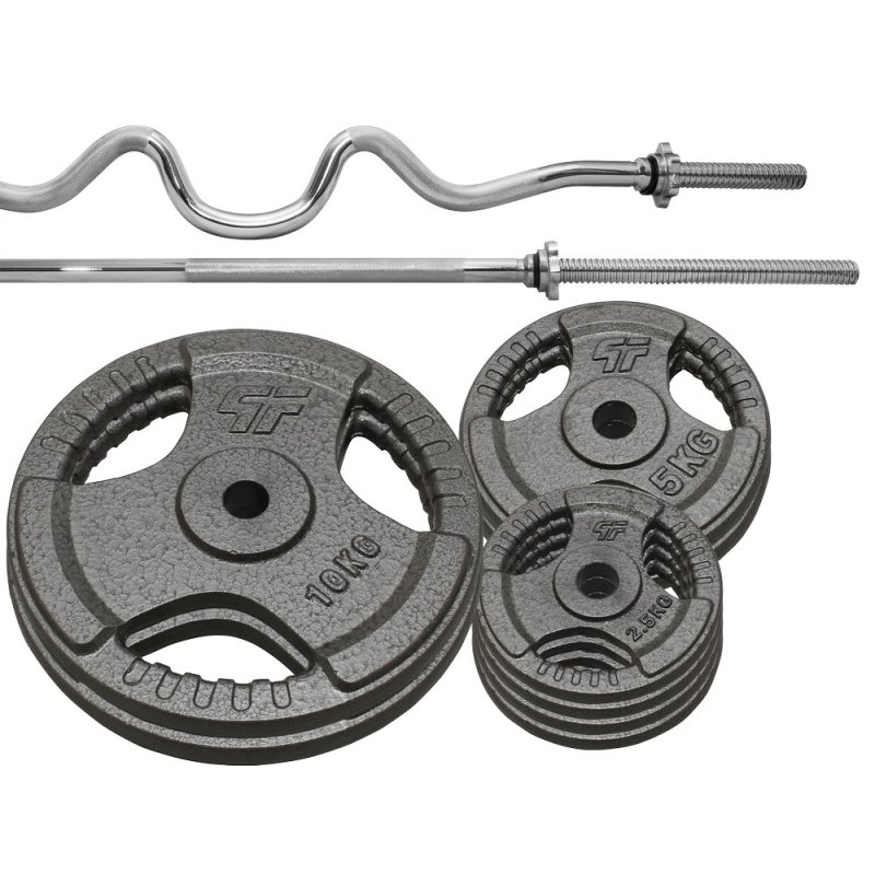 Hartowany gryf łamany podwójnie firmy Platinum Fitness o bardzo wysokiej jakości wykonania zapewnia doskonałe trzymanie w dłoniach dzięki nacięciom części chwytnej oraz bardzo długą eksploatację, a zaciski śrubowe zapewniają komfort i bezpieczeństwo podczas użytkowania oraz szybką i wygodną zmianę obciążeń.