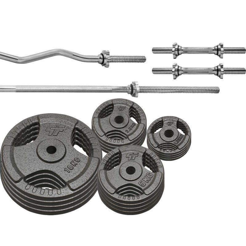 Hartowany gryf łamany pojedynczo firmy Platinum Fitness o bardzo wysokiej jakości wykonania zapewnia doskonałe trzymanie w dłoniach dzięki nacięciom części chwytnej oraz bardzo długą eksploatację, a zaciski śrubowe zapewniają komfort i bezpieczeństwo podczas użytkowania oraz szybką i wygodną zmianę obciążeń.