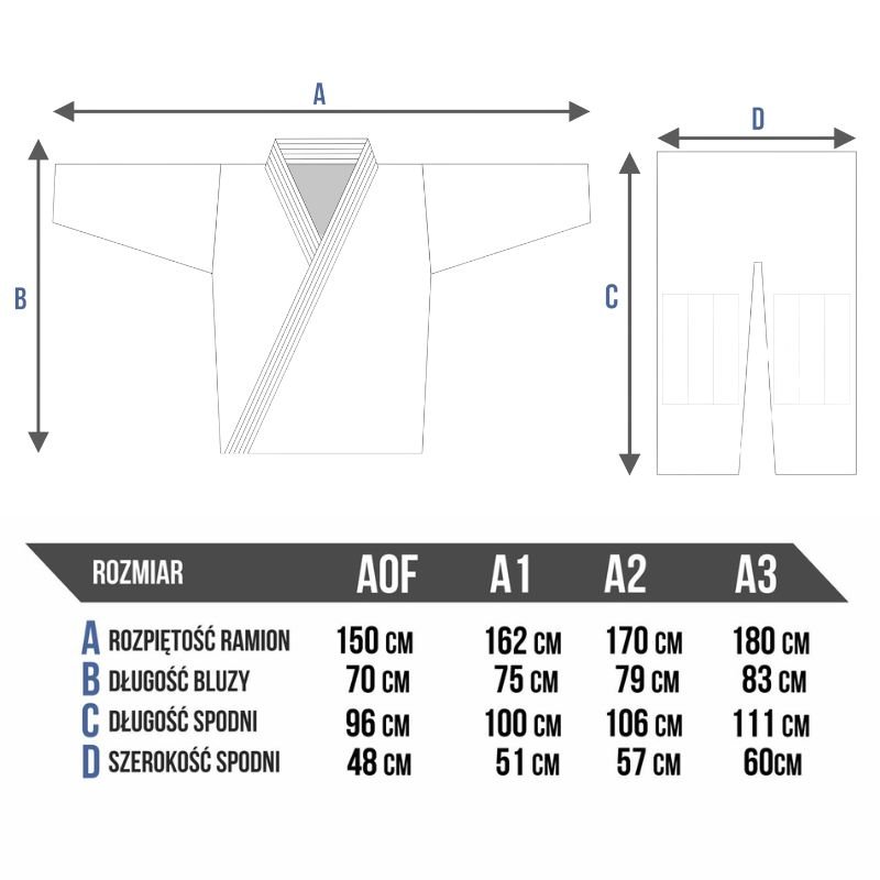 Ostrzeżenia: Przed użyciem kimona upewnij się, że jest w dobrym stanie – sprawdź, czy nie ma uszkodzeń, takich jak rozdarcia, przetarcia czy zaciągnięcia materiału. Wybieraj kimono odpowiednie do rodzaju treningu, aby zapewnić komfort i swobodę ruchów. Regularnie pierz kimono zgodnie z instrukcjami na metce, aby zachować jego wygląd i higienę. Pamiętaj, aby przechowywać kimono w suchym miejscu, aby uniknąć nieprzyjemnych zapachów i uszkodzeń materiału. Trzymaj z dala od ognia.