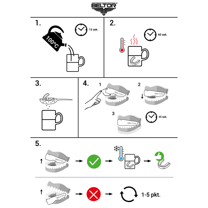 Uwaga: Przed użyciem, należy dostosować ochraniacz do własnego indywidualnego kształtu uzębienia według instrukcji dołączonej powyżej.