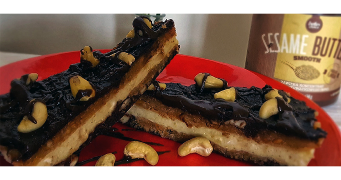 Spód:-100g gorzkiej czekolady -100g suszonych daktyli -20g kako -25g miodu -25g oleju kokosowego -20g ekspandowanego orkiszu Daktyle zalewamy gorącą wodą, w tym czasie rozpuszczamy czekoladę, miód, olej kokosowy. Do blendera wrzucamy kakao,...