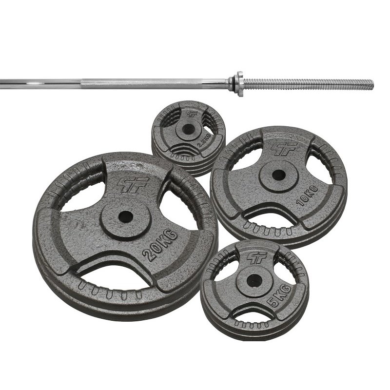 Żeliwne talerze o konstrukcji Tri-Grip, która pozwala na szybką zmianę na sztandze lub gryfie