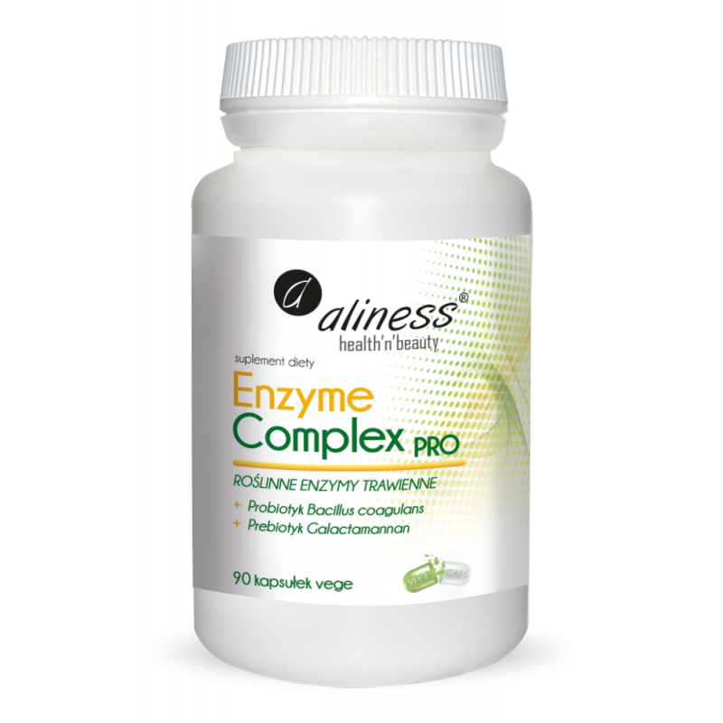 Suplement diety zawierający kompleks 5 roślinnych enzymów trawiennych, uzupełniony o synbiotyk (probiotyk Bacillus coagulans i prebiotyk galactomannan) wspomagające prawidłowy rozkład treści pokarmowych.