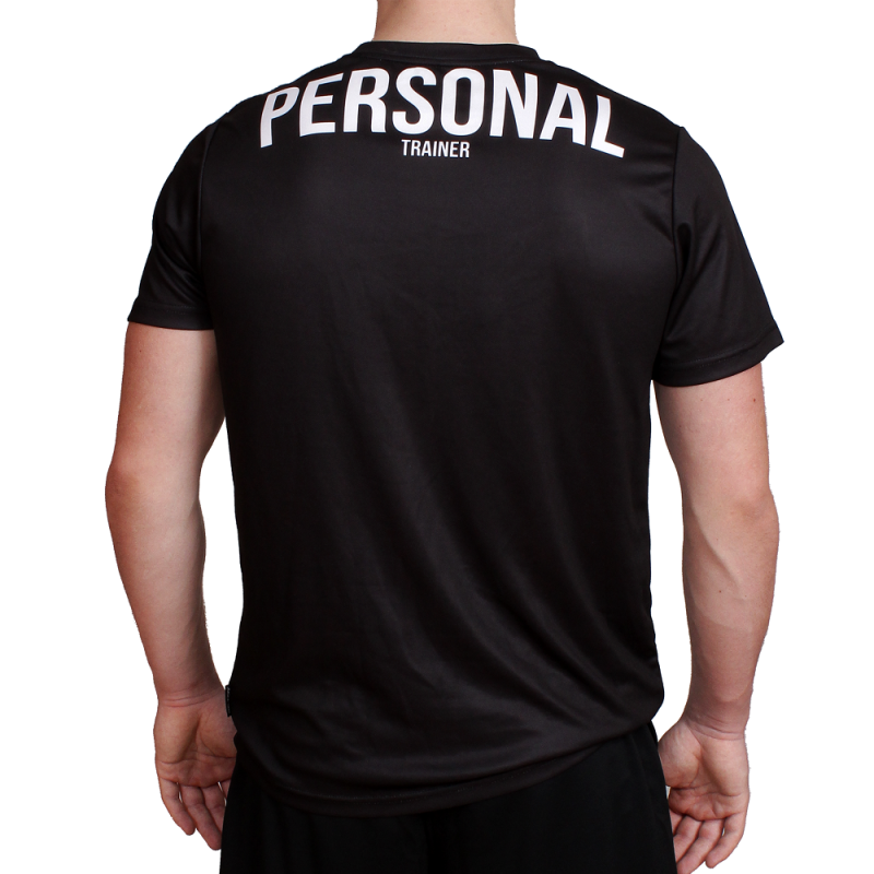 Personal Trener, który ma idealną wielkość. Każdy trener powinien posiadać koszulkę w takim wykonaniu, ponieważ zdecydowanie podkreśla ona profesjonalizm.