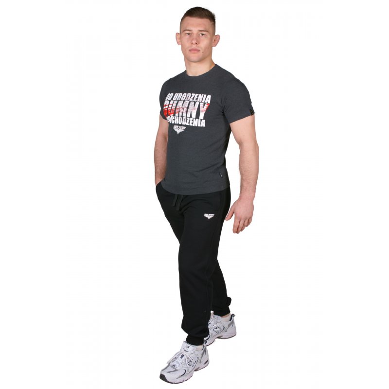 Wysokiej jakości bawełniany T-shirt męski o gramaturze 200 g/m2 z domieszką elastanu. T-shirt posiada ergonomiczny, sportowy krój Slim-Fit. Model charakteryzuje się dużą aplikacją na klatce piersiowej jak i na plecach. Nadruki wykonane zostały metodą sitodruku, dzięki któremu zostaną z Tobą na długo!