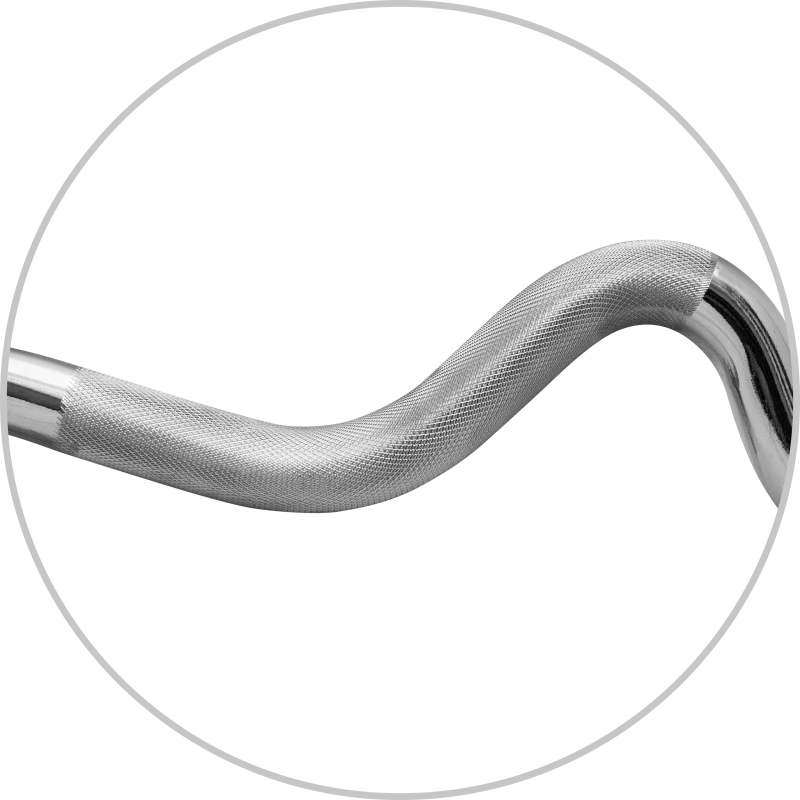 Hartowany gryf łamany firmy Platinum Fitness o bardzo wysokiej jakości wykonania zapewnia doskonałe trzymanie w dłoniach dzięki nacięciom części chwytnej oraz bardzo długą eksploatację, a zaciski śrubowe zapewniają komfort i bezpieczeństwo podczas użytkowania oraz szybką i wygodną zmianę obciążeń.