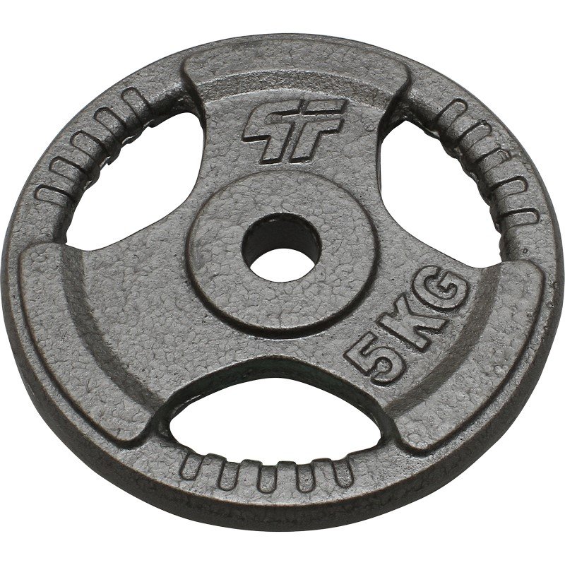 Żeliwne talerze o konstrukcji Tri-Grip, która pozwala na szybką zmianę na sztandze lub gryfie